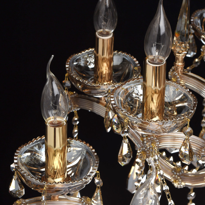 Металлическое основание светильника гальванизировано в цвет золота и закрыто прозрачными стеклянными пластинами. Декоративные розетки выполнены из стекла, отлитого в сложную форму. Светильник декорирован прозрачным хрусталем миндалевидной формы со сложной огранкой.