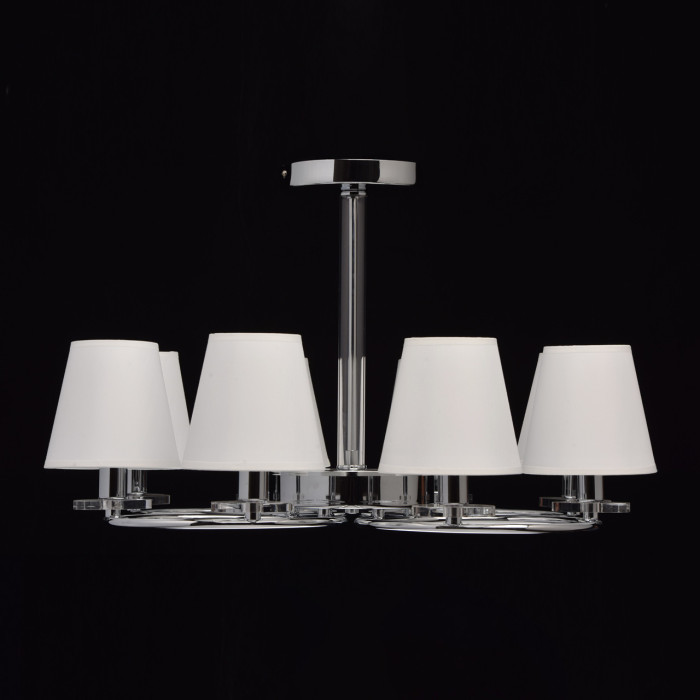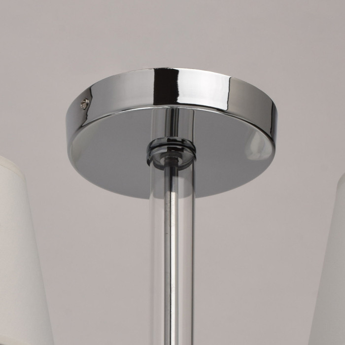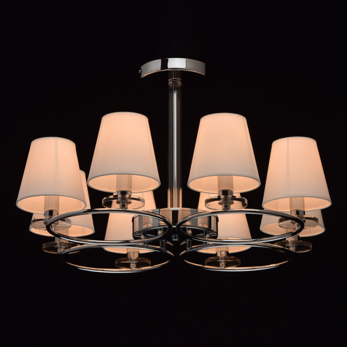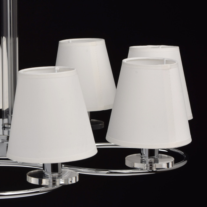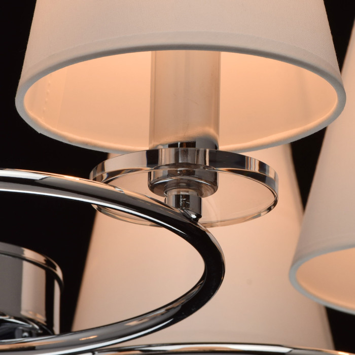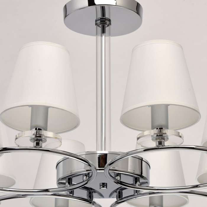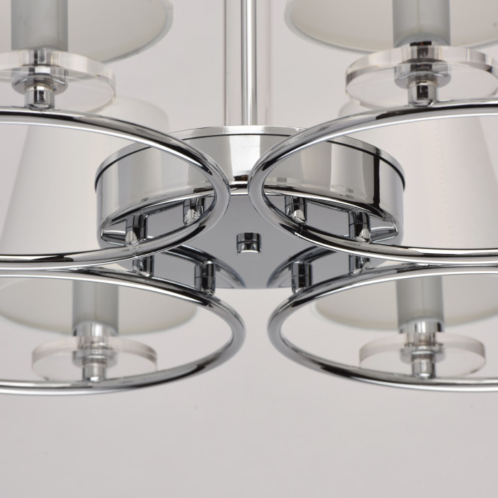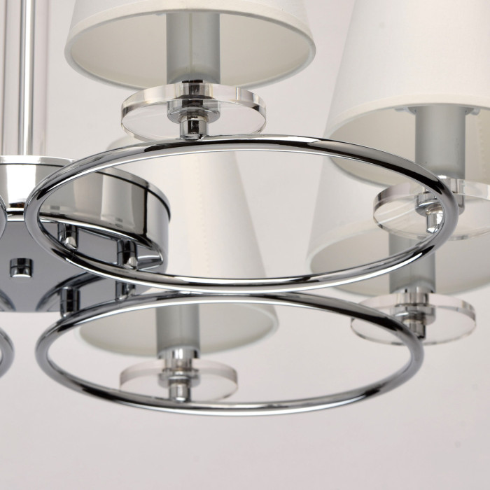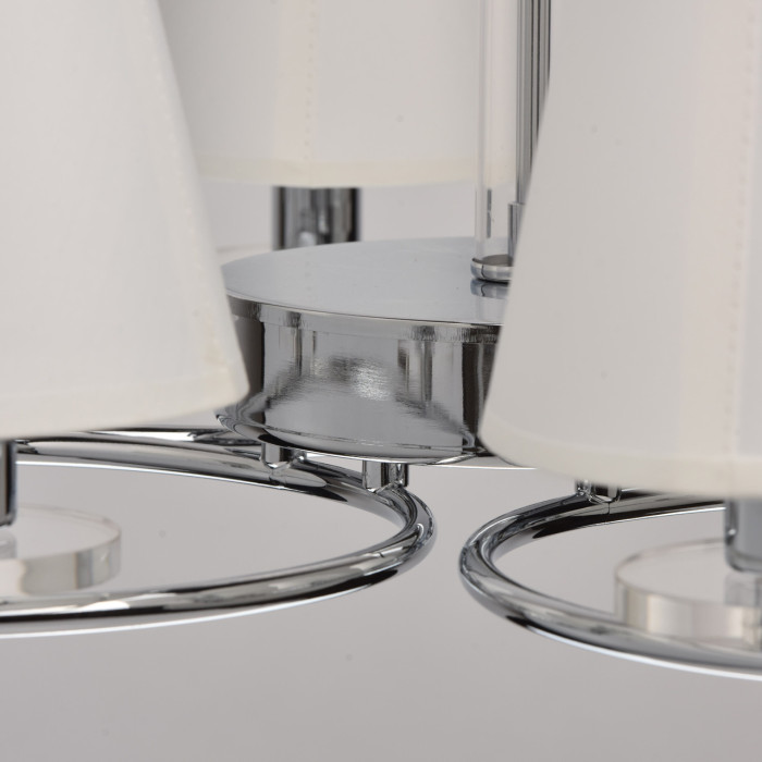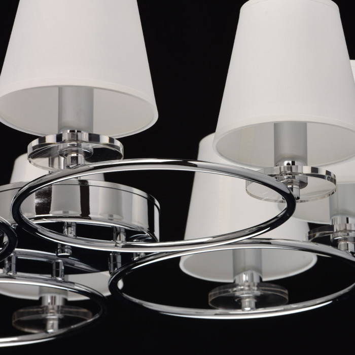 Основание выполнено из металла и гальванизировано в цвет хрома. Рожки в форме колец выполнены по технологии проката на роликовом станке. Декор центральной оси и розетки выполнены из прозрачного акрила. Абажуры выполнены из белого текстиля с термостойким акрилом внутри. Стыки абажуров прошиты.