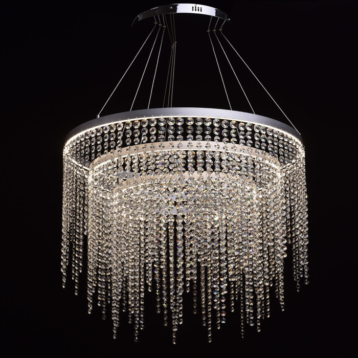 Основание светильника выполнено из нержавеющей стали и отполирована до зеркального блеска. Арматура светильника выполнена из сплава алюминия и окрашена в цвет серебра методом порошкового окрашивания. Светильник декорирован подвесками из хрусталя 6-ти видов и разных размеров, от большего к меньшему сверху-вниз.